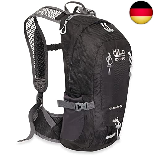 HiLo sports Allrounder cycling hiking backpack, 14 litres, water-repellent with back ventilation system. The Allrounder 14 backpack for cycling is the perfect companion for your next bike trip and your upcoming bike tours. With a pleasantly large storage space, you can store your bike clothes and your most important bicycle accessories. Enjoy your freedom with the road bike backpack and travel without worry. - Feel nature Whether for cycling or for a day hike. This bike backpack can accompany you during all outdoor activities.Thanks to the ventilating carrying system, you sweat less and your shirt stays dry on the back for longer.In addition, the backpack for the bike is very comfortable to wear. - Space for small objects. Wallet pocket, mobile phone and key chain can be stored at the top of the zipped compartment. This way you get to your valuables faster and don't have to rummage around. For individual keys or the key chain, there is a pendant. This allows you to open your front door faster after your trip. - Hydration bladder system included. If you prefer a hydration bladder instead of a water bottle, you will find space for it in the sports backpacks. The main compartment has a divider and there is space for a hydration bladder of up to 2 litres. There is a Velcro fastening for the perfect fit. The hose comes out through an opening in the lightweight travel backpack and then runs forward over the carrier.Spezifikationen